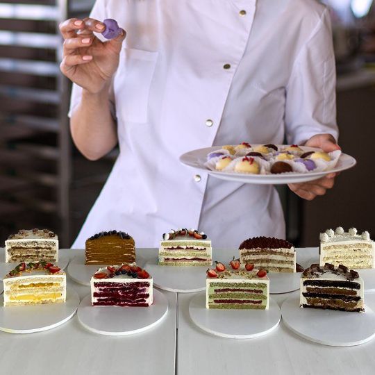 Наши ярусные торты начинаются с двух ярусов весом от 5 кг и могут достигать больших размеров – трёхъярусные торты от 7 кг, а четырёхъярусные – от 10 кг. При этом мы всегда открыты для обсуждения индивидуальных требований, чтобы каждый торт был уникальным и соответствовал вашим ожиданиям.